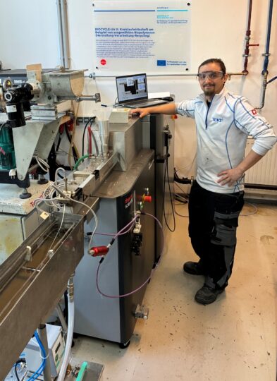 Can corrosive or reactive materials be processed in extrusion? With our new 16 mm twin-screw extruder, we are investigating precisely that, with a focus on the material recycling of polyester-based bioplastics. This compounder, equipped with stainless steel barrels and screws, can be operated at up to 400 °C and up to 1100 rpm to cover even extreme processing conditions. Solids and liquids can also be added at various positions, and the screws can be modularly adjusted – a real all-rounder. We would also like to thank the province of Upper Austria for funding the EFRE research project BioCycle-UAII, which made this investment possible.