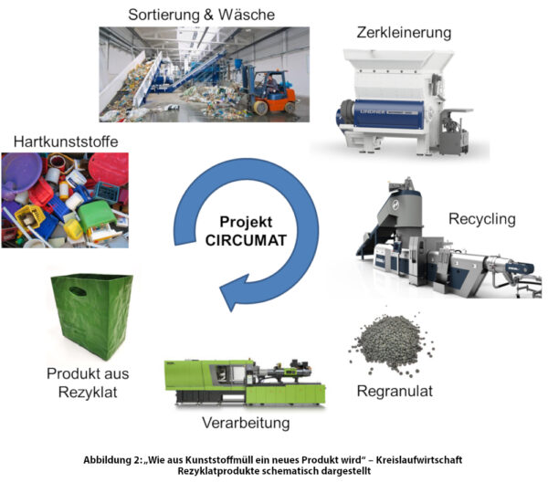 Ziel des Projektes Circumat ist es Kunststoffabfallströme wieder zu hochwertigen Rezyklaten aufzubereiten und darauswiederum neue, ebenso hochwertige Produkte herzustellen. Um zu zeigen, dass Kreislaufwirtschaft auch in der Kunststoffbranche erfolgreich umgesetzt werden kann, bringen Vertreter aller Akteure entlang der gesamten Wertschöpfungskette ihre Expertise in einem Projektteam ein, das an der Umsetzung dieser Zielsetzung arbeitet. Beteiligt sind Borealis Borealis als Neuwarehersteller (und durch die mit Borealis verbundenen Unternehmen als Recycler), Greiner Packaging als Konverter/Verpackungshersteller, LAVU als Abfallsammler und Logistiker, Lindner als Hersteller von Waschanlagen und Shreddern, Erema als Recyclingmaschinenhersteller und Innplast als Recycler. Wissenschaftlich begleitet wird das Projekt vom Institut für Polymerextrusion und Compounding der Johannes Kepler Universität Linz bei den Kunststoffverarbeitungsthemen und dem TCKT GmbH, welches verschiedene Analysen und Charakterisierungen durchführt.